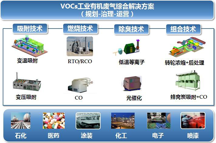VOCs處理方法有數(shù)十種,其原理主要有回收有價值溶劑的回收技術和分解VOCs分子的破壞技術兩大類,實際應用中更多是采用組合式技術。比如:采用濃縮和燃燒結(jié)合的技術治理低濃度大風量廢氣,減少裝置投資;采用催化燃燒(CO)或蓄熱式燃燒(RTO)技術實現(xiàn)低能耗下VOCs的處理;根據(jù)VOCs自身溶解度、沸點等特性選擇變溫吸附或變壓吸附進行溶劑的回收,具體如何選擇取決于客戶生產(chǎn)線的工況。