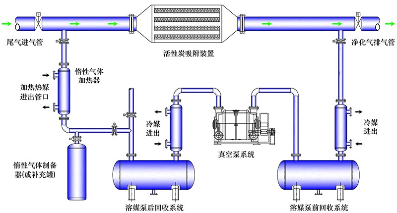 我公司設計生產(chǎn)的活性炭脫附裝置,是根據(jù)不同吸附質(zhì)的沸點和臨界點,用一定溫度下的惰性氣體將吸附質(zhì)析出。惰性氣體經(jīng)過加熱器加熱到一定溫度進入飽和活性炭裝置系統(tǒng),惰性氣體將飽和活性炭內(nèi)的吸附質(zhì)加熱到沸點,吸附質(zhì)隨小分子惰性氣體揮發(fā)出來進入冷凝器通過一次冷媒冷凝,大部分吸附質(zhì)冷凝成液體進入溶媒回收系統(tǒng)氣液分離與惰性氣體分開。物質(zhì)的吸附量是隨壓力的升高而升高的,隨壓力的降低而降低。含有少量吸附質(zhì)的惰性氣體經(jīng)真空泵減壓后進入二次冷凝器,經(jīng)二次降溫冷凝將少量的吸附質(zhì)分離回收。處理后的惰性氣體再經(jīng)干燥器干燥,加熱器加熱進入活性炭吸附裝置,循環(huán)使用。在實際工作中,這種方法也是常用的脫附方法。